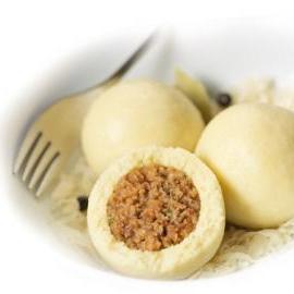 Zutaten: Teig 75%: Wasser,WEIZENmehl, Kartoffelflocken (Kartoffeln, Gewürzextrakte), 8,5%**, Kartoffelflocken, 8,5%**, Rapsöl, Kartoffelstärke 1,5%**, HühnerVOLLEIpulver, WEIZENgrieß, Speisesalz jodiert (Salz, Kaliumjodid), Füllung 25%: Grammeln 21%**, Wasser, Petersilie, Rapsöl, Zwiebeln, Speisesalz jodiert (Salz, Kaliumjodid), Gemüsebouillon (jodiertes Meersalz, [Meersalz, Kaliumjodat], Stärke, konzentrierter Gemüsesaft [Karotten, Zwiebeln], Karotten, Palmfett, Zwiebeln, Gewürze, Kräuter, Kürbis, Lauch, Sonnenblumenöl, Knoblauch), Knoblauch, Pfeffer **bezogen auf das Gesamtprodukt.